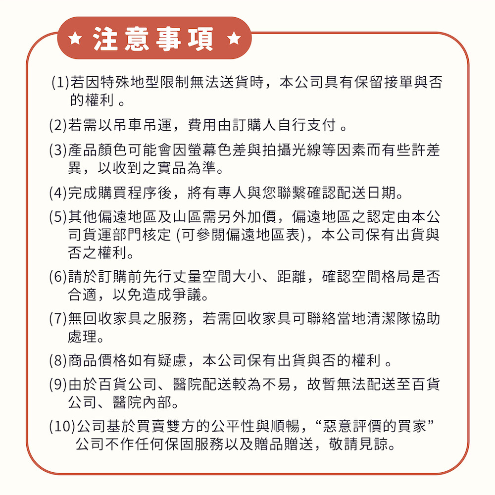 3.若因特殊地形限制無法送貨時,本公司具有保留接單與否之權利。4.若需以吊車吊運,費用由訂購人自行支付。