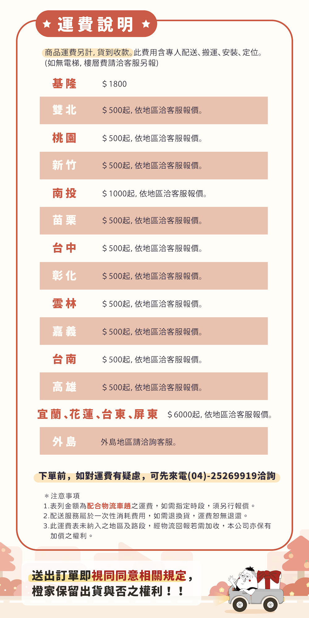 6.基隆/南投/雲林/嘉義/台南/高雄需加收500元運費,偏遠地區請洽詢運費。